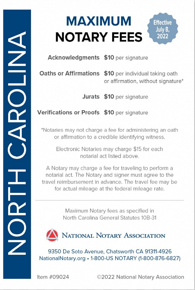 All fees listed are compliant with North Carolina General Statute §10B-31. Notarial fees are per signature or act. Travel and service fees must be agreed upon in advance.